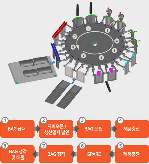 ´Ù·®ÀÇ ÆÄ¿ìÄ¡ ÀûÀç ¹× °ø±ÞÀÌ °¡´ÉÇÑ Æ¯¼ö ÆÄ¿ìÄ¡ °ø±ÞÀåÄ¡Special designed pouch feeding conveyor for stacking many pouches and no jams of pouches